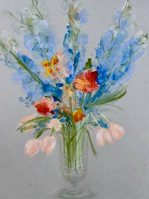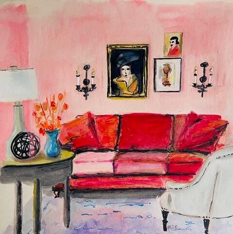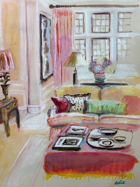 Ik werk met verschillende gemengde technieken en probeer een sfeer van een kamer te vangen. Mijn stijl is speels en kleurrijk.