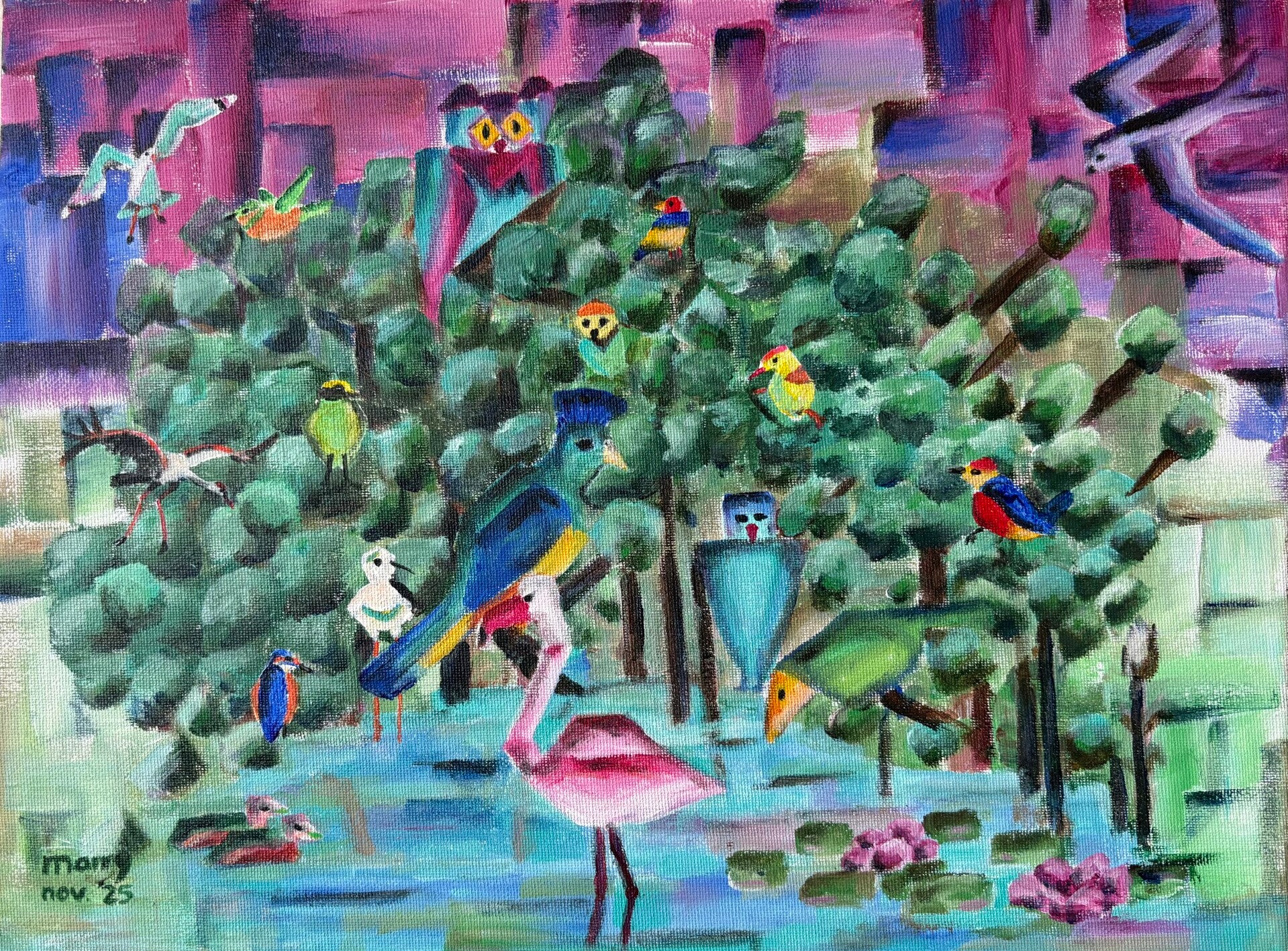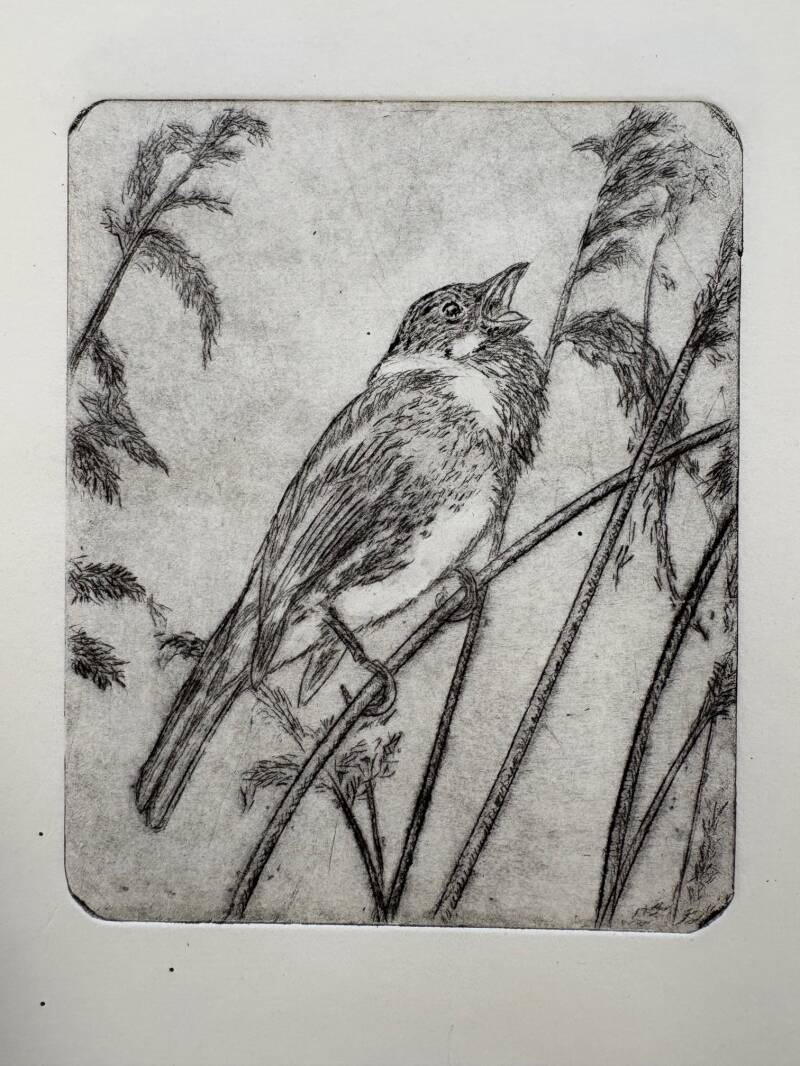 Vogelparadijs 40x30 cm acryl op doek Rietzanger 10x12,5 cm ets Meer in Taiwan 50x40 cm olieverf op doek